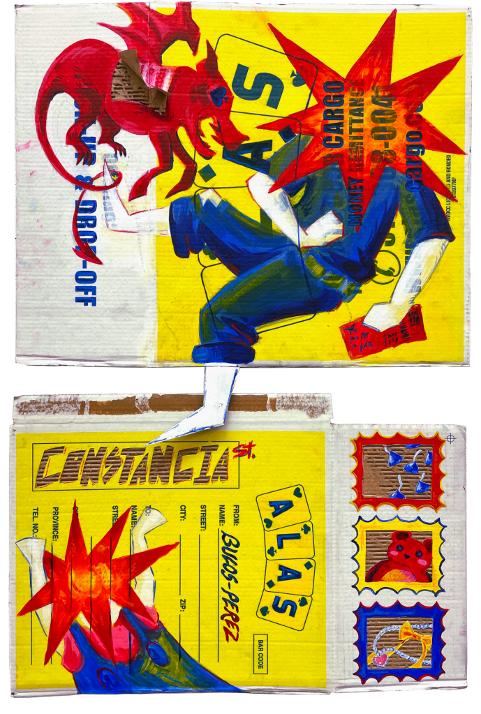 “Balikbayan” explores the theme of migration through the culture of balikbayan boxes: a tradition in which overseas Filipinos ship goods that are less accessible back in the Philippines. This tradition provides a sense of connection and comfort to families that are oceans away. However, the normalization of showing affection via materiality and consumption has perpetuated the cycle of migration, distracting from the core of the issue–American imperialism.